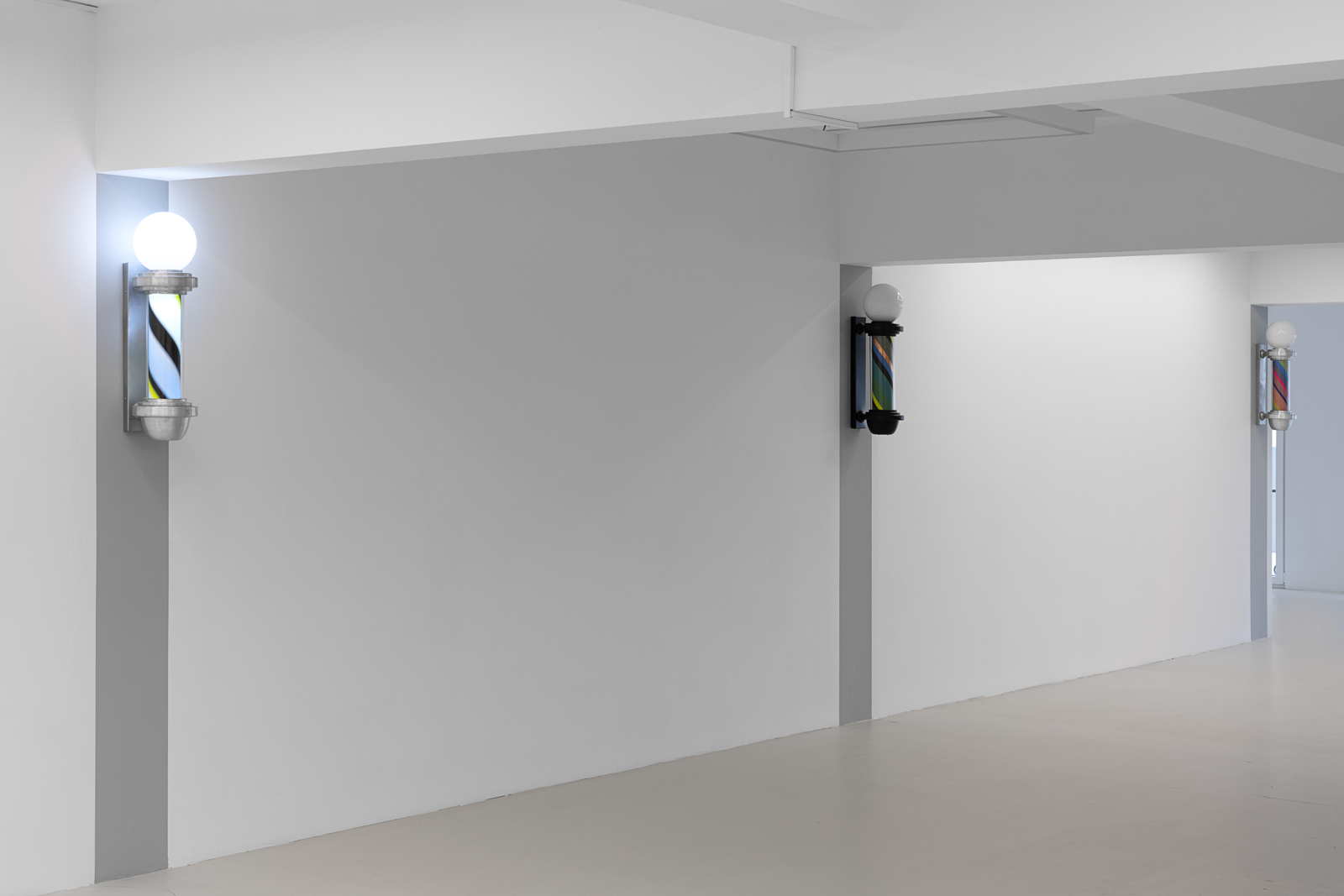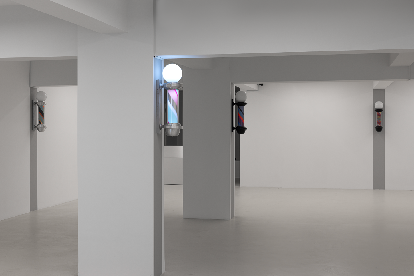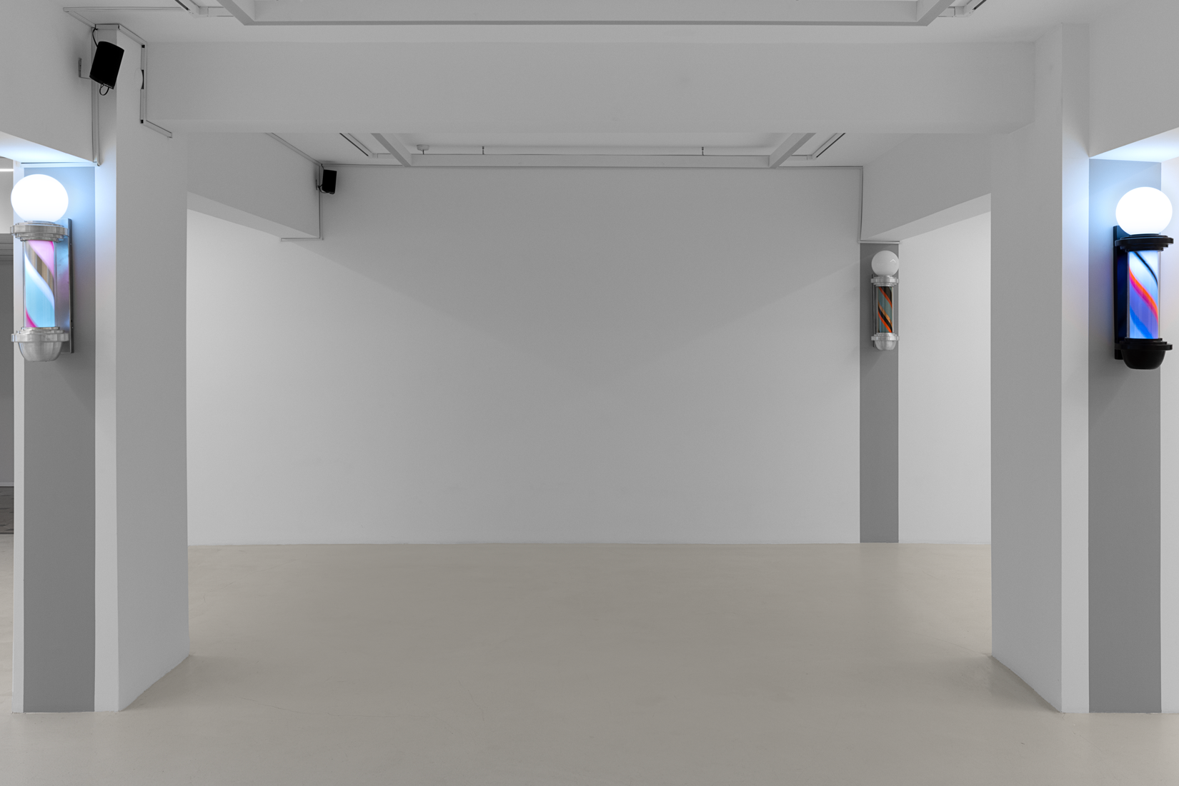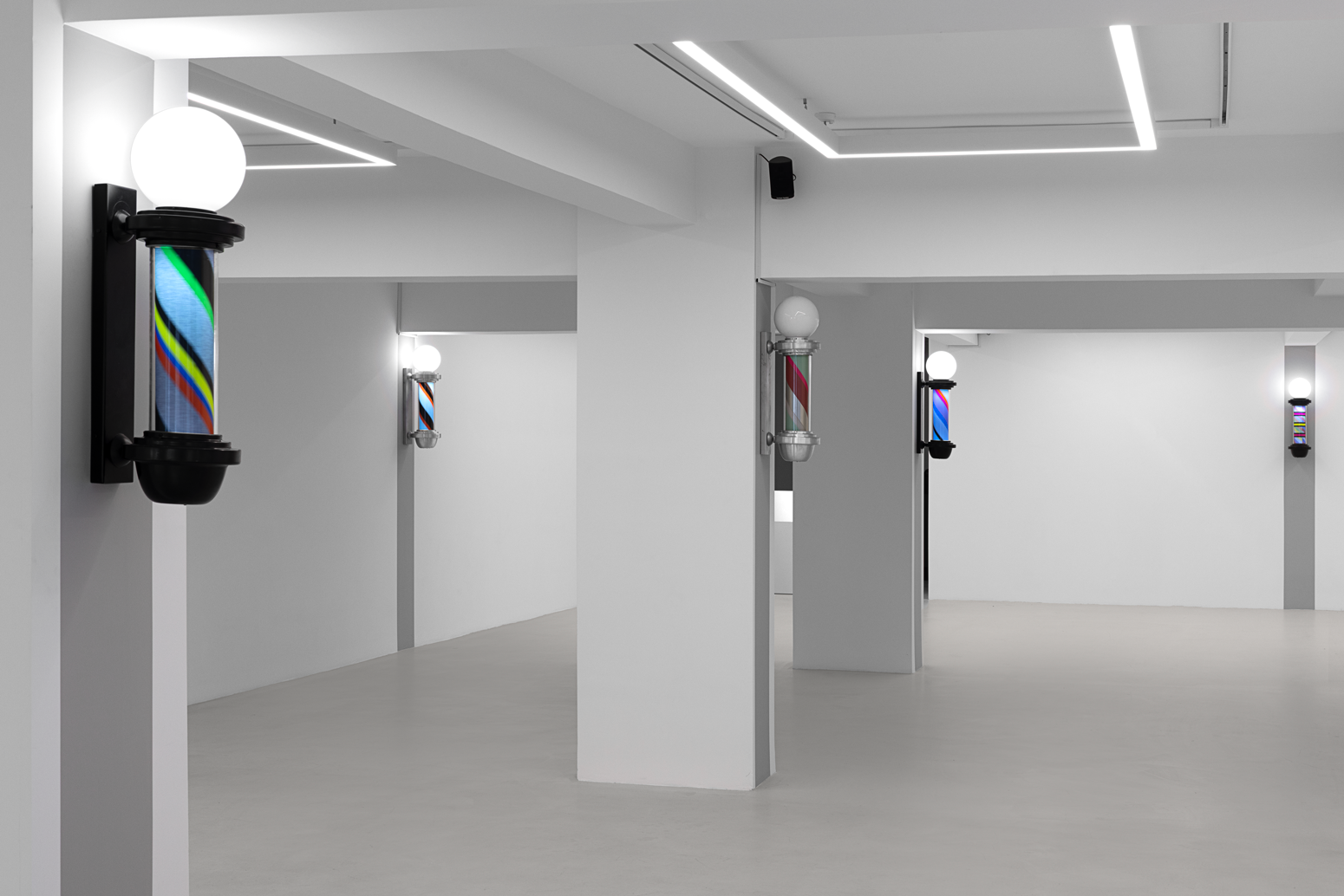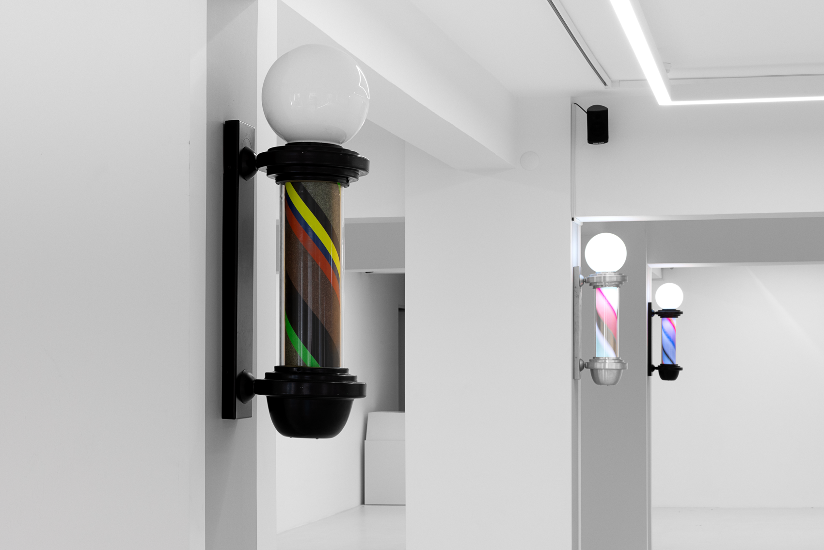 Once a symbol of public life and equality, the barber’s lamp originally signified the intertwined elements of red, white, and blue—representing blood, bandages, and veins—a visual emblem of both bodily and social healing. Paker reverses this symbolism: the colors shift, multiply, and vibrate. Each lamp turns at its own rhythm; each rotation becomes a meeting point of time and color.