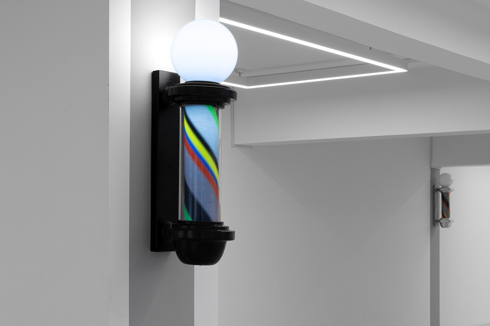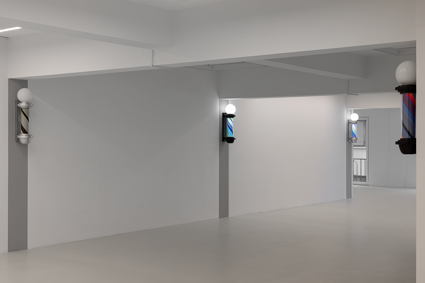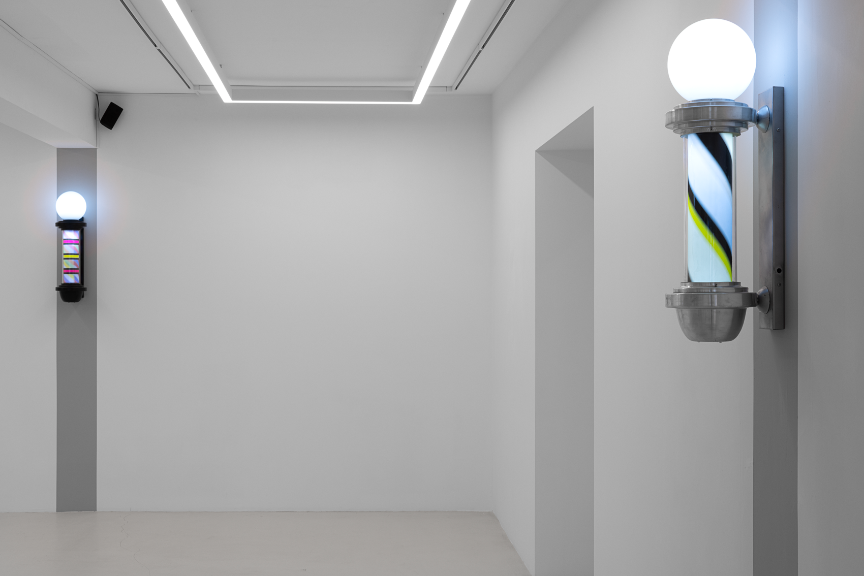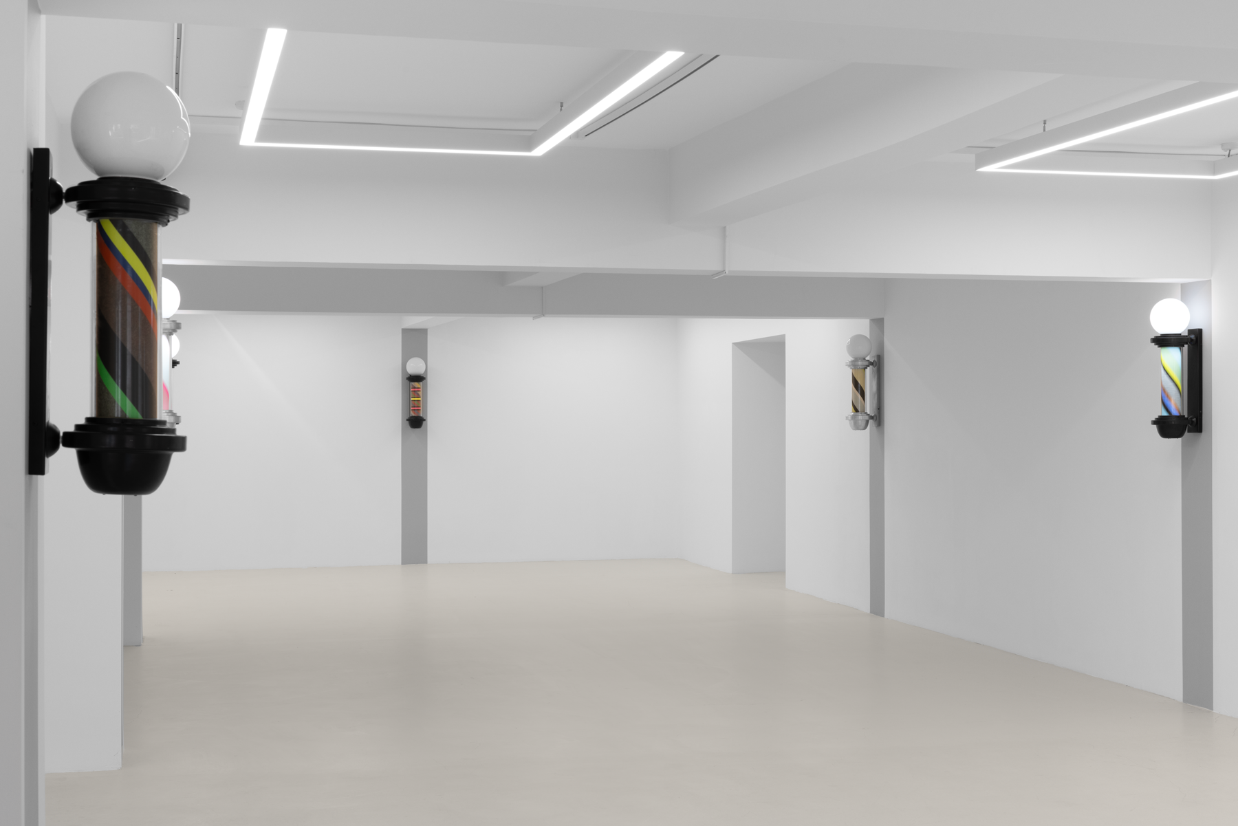 Once a symbol of public life and equality, the barber’s lamp originally signified the intertwined elements of red, white, and blue—representing blood, bandages, and veins—a visual emblem of both bodily and social healing. Paker reverses this symbolism: the colors shift, multiply, and vibrate. Each lamp turns at its own rhythm; each rotation becomes a meeting point of time and color.