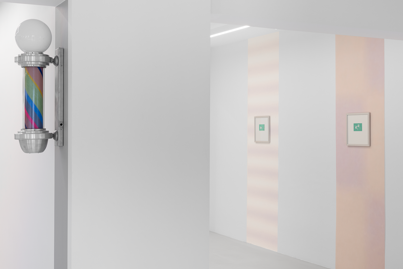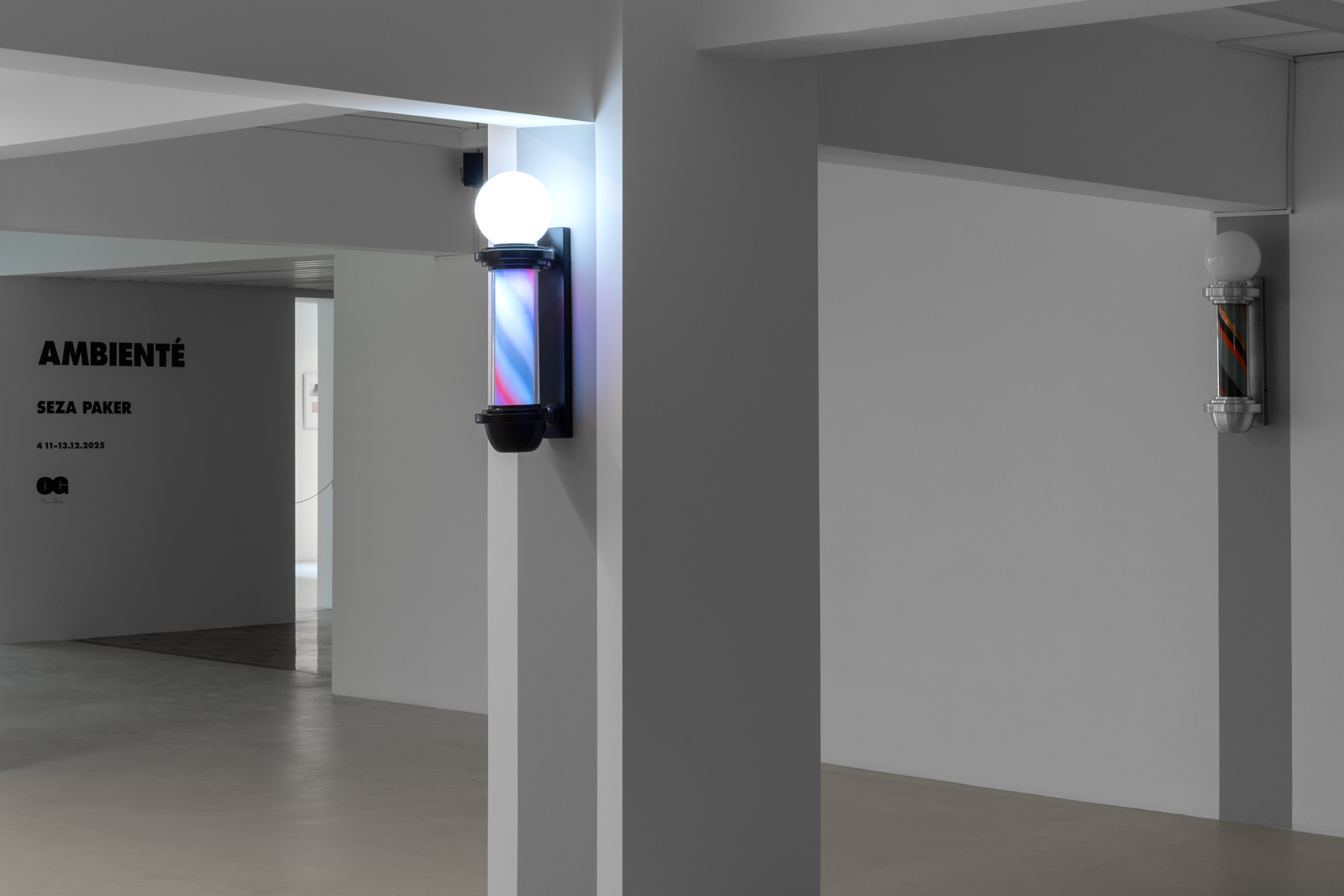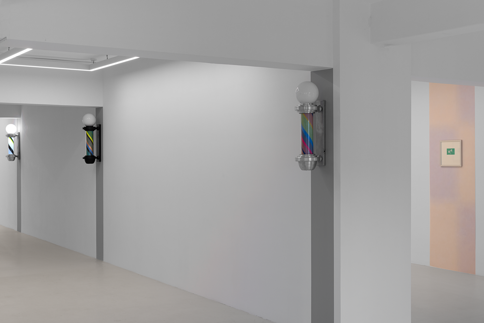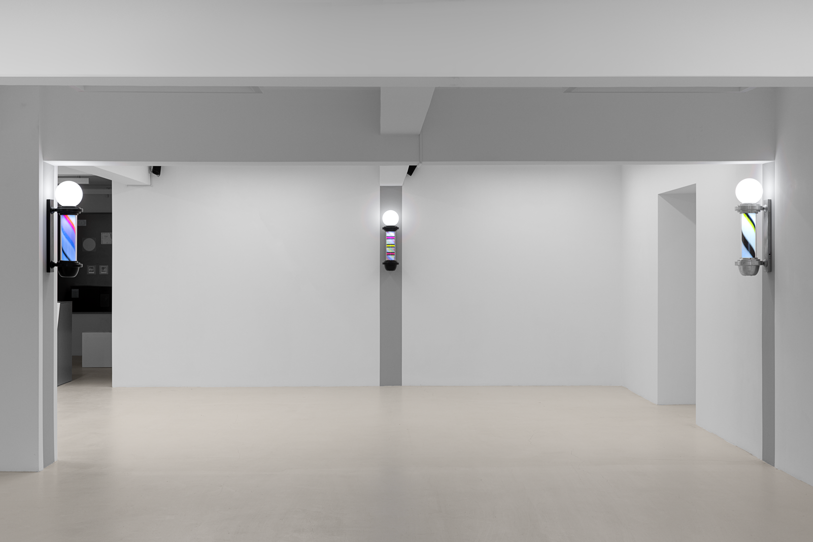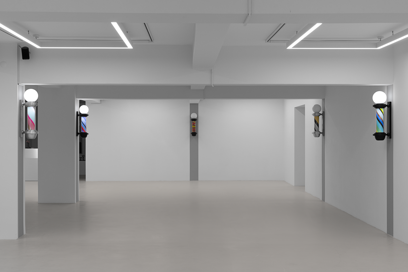 Once a symbol of public life and equality, the barber’s lamp originally signified the intertwined elements of red, white, and blue—representing blood, bandages, and veins—a visual emblem of both bodily and social healing. Paker reverses this symbolism: the colors shift, multiply, and vibrate. Each lamp turns at its own rhythm; each rotation becomes a meeting point of time and color.
