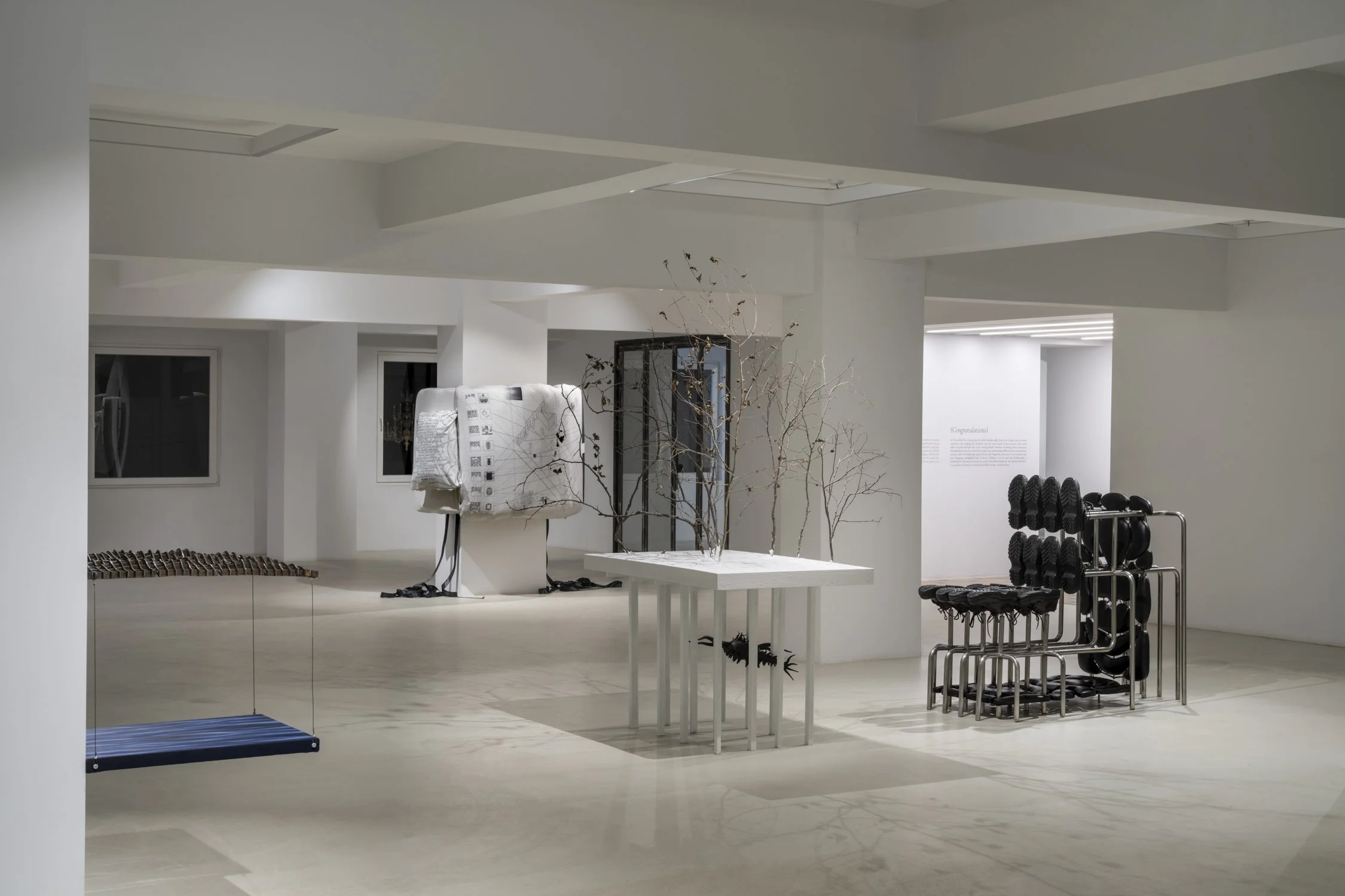 meta-masters, sass and drywall, 2024, Stainless steel pipe-laser cut, Leather work shoes with steel toe, Artificial leather, Sponge, MDF, Wood, Wall paint, Plaster, Pla, Tree branch