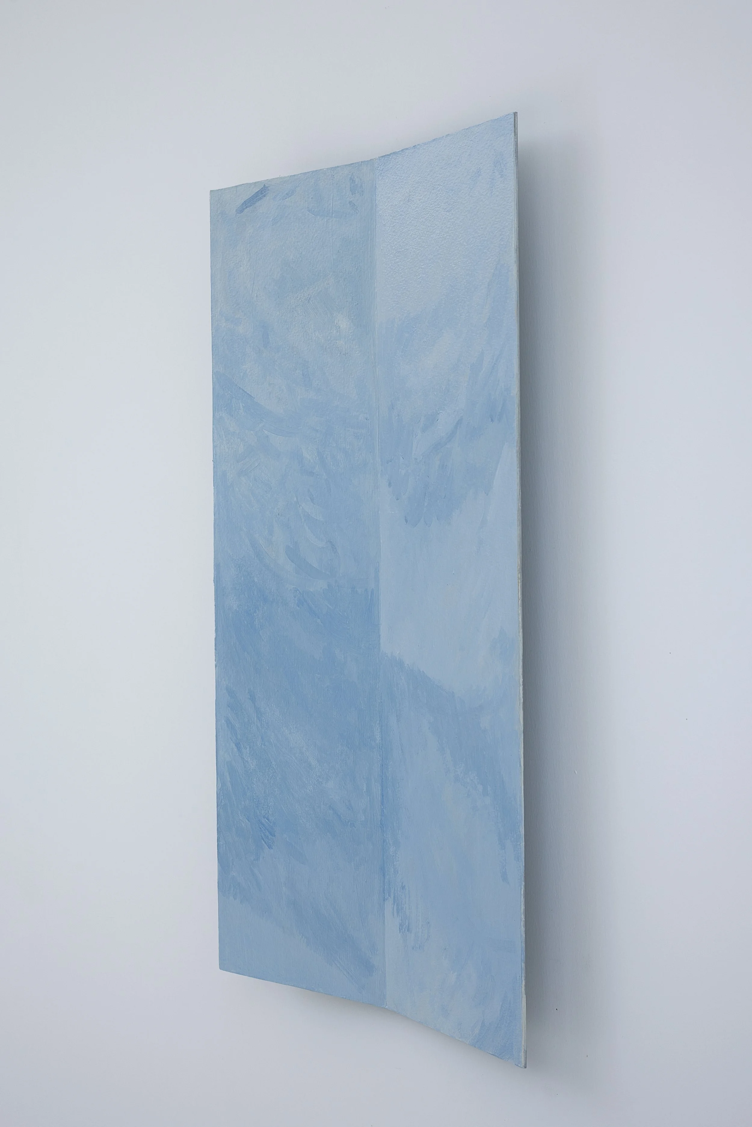 Alongside the canvases are folds, where a thin, creased aluminum panel gives the painting surface a subtle sculptural dimension, thereby interacting with light in a more literal way. While the paintings on canvas seem to create their own internal light through layers of paint, the inherent structure of the folds divides light, reflecting and dispersing it with more immediate brushstrokes, providing deeper insight into Defne’s hand.